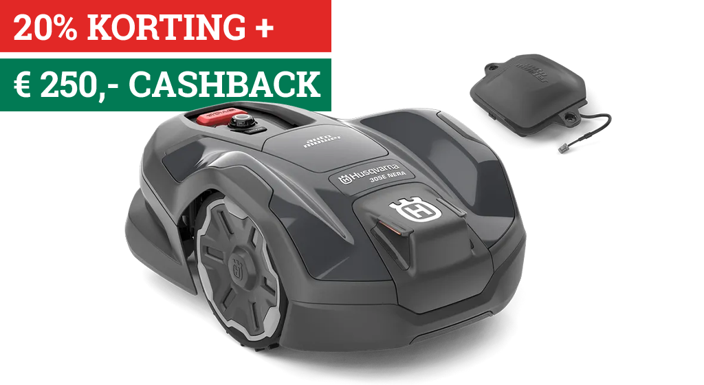 – Koop voor 31-05-2026 een Automower® 305, upload hier uw factuur en gegevens voor 30-06-2026 en ontvang €100,- cashback van Husqvarna. Klik voor de voorwaarden van deze actie.