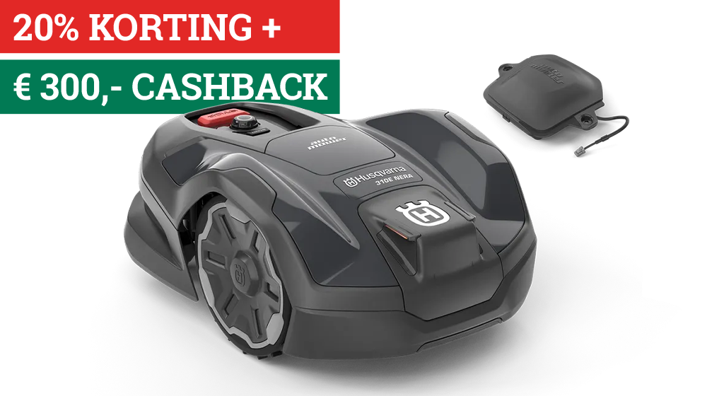 – Koop voor 31-05-2026 een Automower® 310E NERA, upload hier uw factuur en gegevens voor 30-06-2026 en ontvang €300,- cashback van Husqvarna. Klik voor de voorwaarden van deze actie.