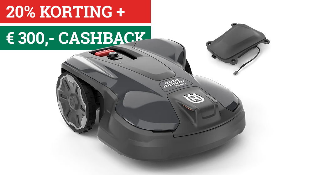 – Koop voor 31-05-2026 een Automower® 320 NERA, upload hier uw factuur en gegevens voor 30-06-2026 en ontvang €300,- cashback van Husqvarna. Klik voor de voorwaarden van deze actie.
